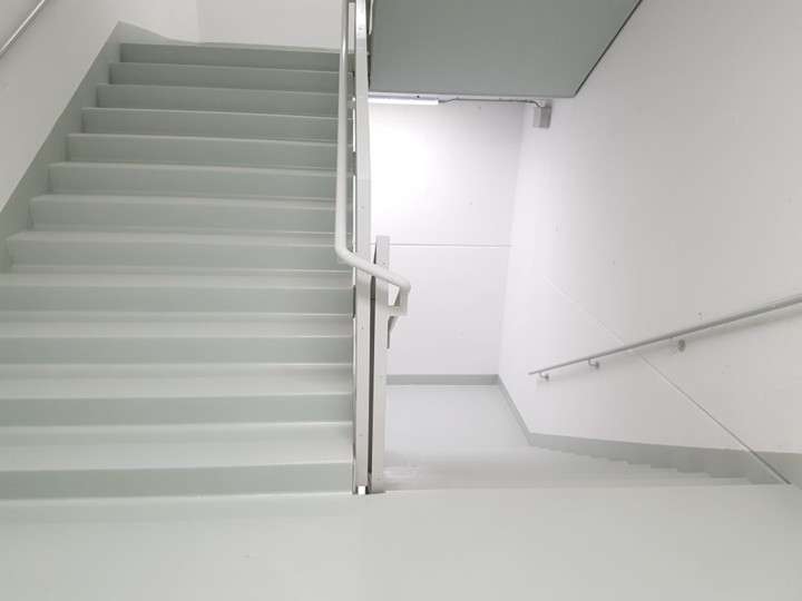 Per un eccellente mantenimento dell’aspetto estetico nel tempo, il sistema è stato chiuso con il trattamento opaco antiusura, antipolvere e antiscivolamento in resina poliuretanica POLISTAR P 867.  Il medesimo rivestimento lo si trova nei locali tecnici e nel corpo scala del parcheggio.