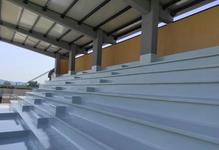 Negli spazi ad uso sportivo spesso si richiedono impermeabilizzazioni antisdrucciolevoli, da applicare nelle aree di tribuna e nei corridoi di accesso degli stadi. La sabbia di quarzo antisdruccioloconsente di realizzare un’impermeabilizzazione sicura e resistente al calpestio intenso della tifoseria.